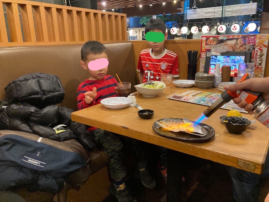 最初に運ばれてきた”しめ鯖”を、店員さんがガスバーナーで炙ってくれたのですが、その様子を見ながら次男と三男は固まっていましたw